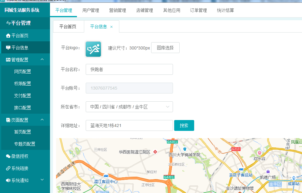 我们可以在快跑者的平台管理——平台信息,在这里设置平台的log、名称、地址等基本信息。