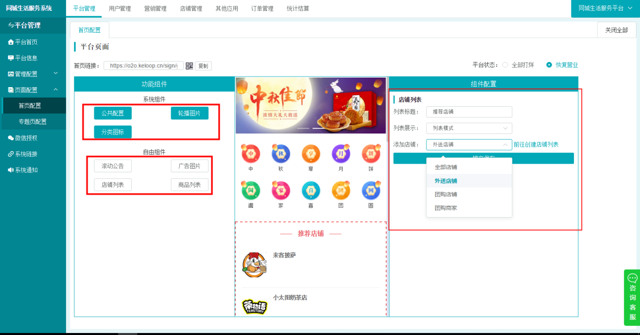 同城生活服务系统里面我们也可以设置自己的首页样式,平台管理——网页配置——首页配置,对平台的显示页面进行设置,左边是功能组件的选择,右边对功能插件的具体显示和跳转的链接进行设置,中间则是显示你设置后的页面,通过实际的需求和美观进行自由设定。