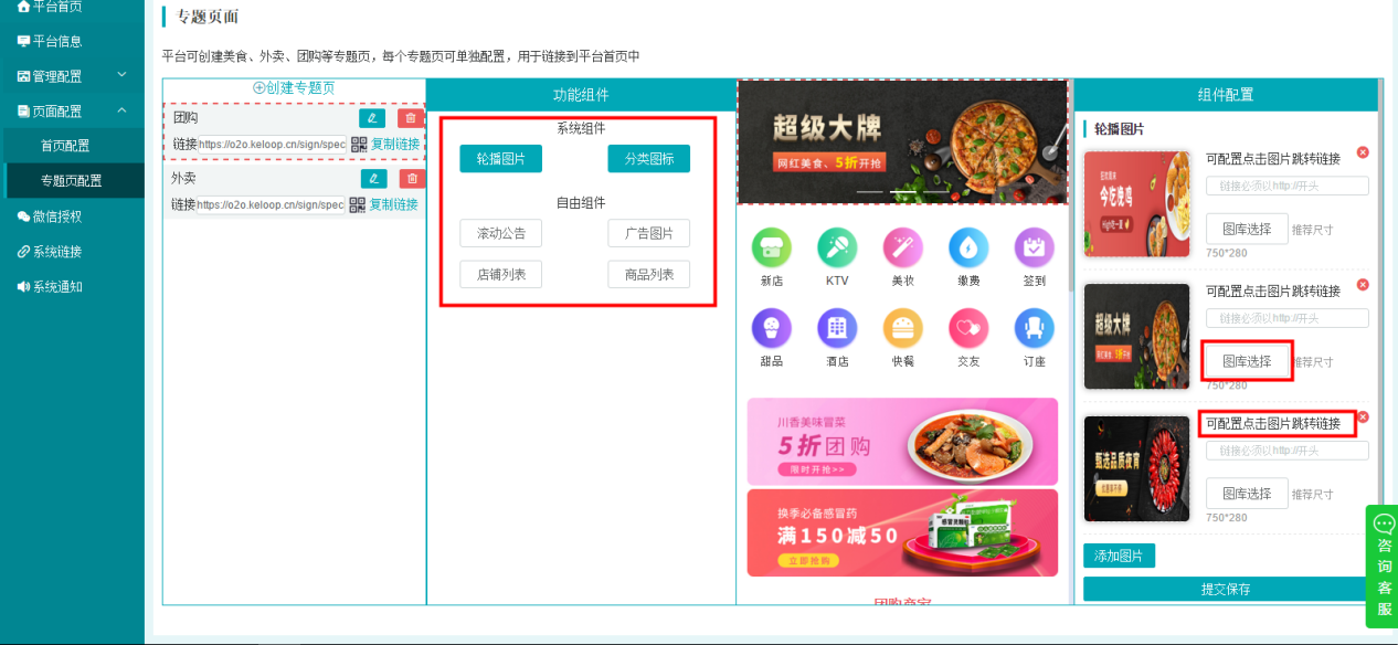 平台管理——网页配置——专题页配置,此页面可以针对节日,***等活动进行设置活动页面,设置方式与首页配置一样,想应用的话***直接在微信公众号后台进行链接更改即可。